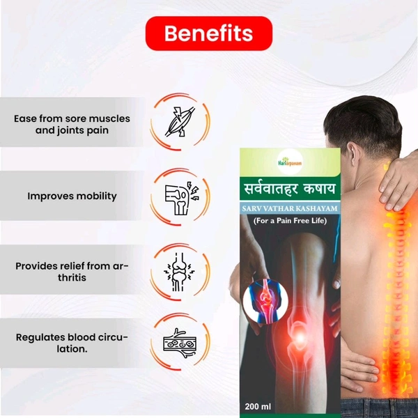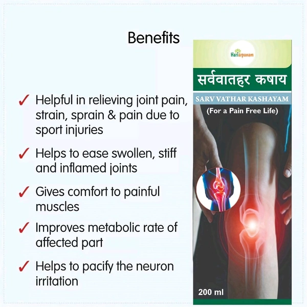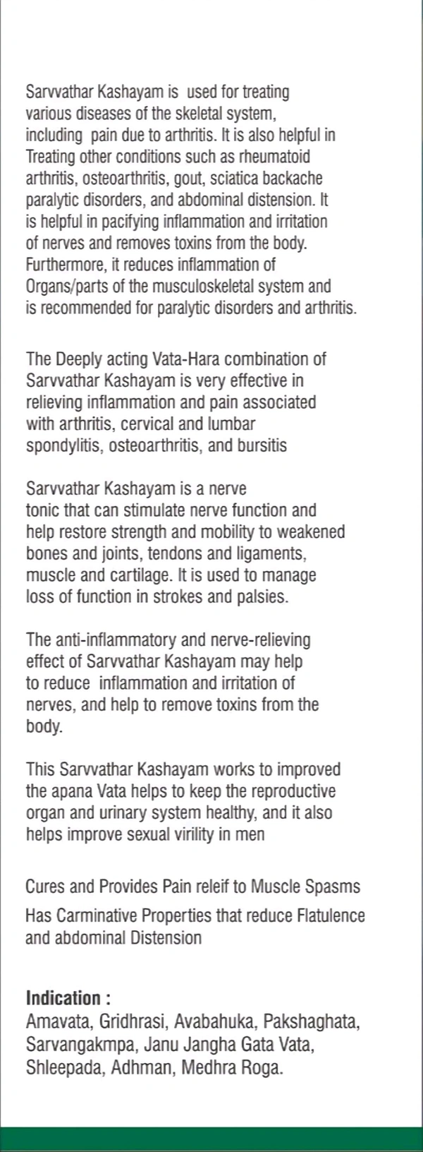 Sarvvathar Kashayam is a medication used for treating various diseases of the skeletal system, including pain due to arthritis. It is also helpful in treating other conditions such as rheumatoid arthritis, osteoarthritis, gout, sciatica, backache, paralytic disorders, and abdominal distension. It is helpful in pacifying inflammation and irritation of nerves and removes toxins from the body. Furthermore, it reduces inflammation of organs/parts of the musculoskeletal system and is recommended for paralytic disorders and arthritis.